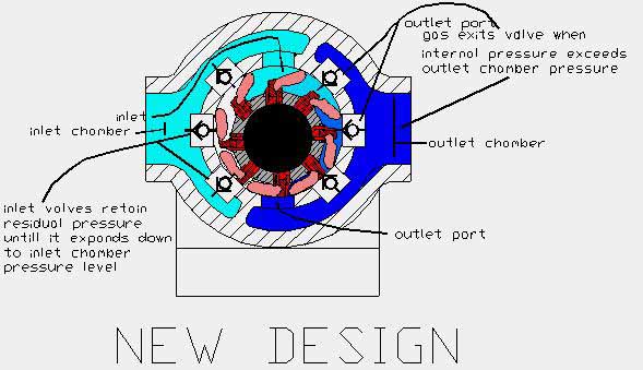One of the biggest (and most obvious) advantages of this design (besides the efficiency which is discussed on "Tech Page 2") is the wear on the "vanes". With the "old style" rotary compressor, the point of contact of the vanes remains remains constant. (IE- the point of the vane with the most contact with the cylinder wall remains consistent throughout the entire cycle). This creates considerable wear on that point in the vain, causing the vanes to have to be replaced/repaired often.