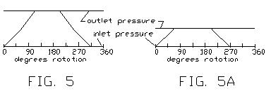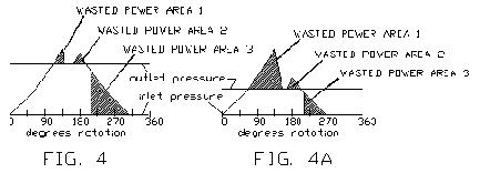 FIG. 4 & 4A illustrates the wasted power with a conventional rotary compressor. Fig. 4 represents one level of output, while Fig. 4A represents the same compressor's wasted power when the outlet pressure is decreased. | ||||